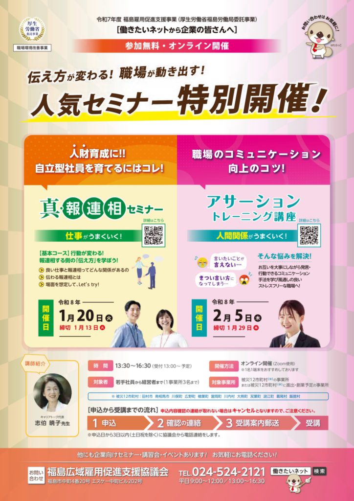 この度、福島広域雇用促進支援協議会より、「真・報連相セミナー」「アサーショントレーニング講座」開催の告知がありましたのでご案内させていただきます。